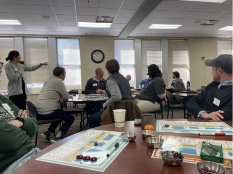 Following the climate game was a set of five lightning talks from Great River Greening and Minnesota Climate Adaptation Partnership about their research and findings from recent precipitation and hydrological modeling work. The lightning talks highlighted that Minnesota is experiencing an increase in “whiplash” events where flash floods are followed by extended drought periods, and that there is a projected trend of wetter winters and springs, with drier summers and falls.