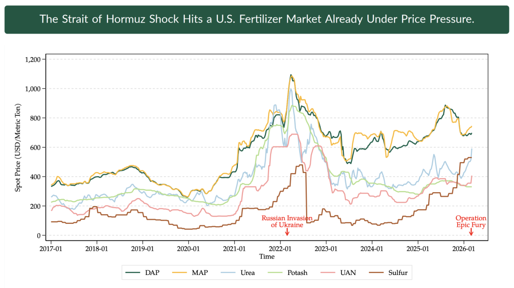 Agricultural production expenses had already been projected to be at a historic high for 2026 (ERS 2/5). Thus, the potential for further price increases has the agricultural community on alert. Oil and gas are directly and indirectly essential agriculture inputs. Directly, fuel is an important piece of a farm operations itself –  accounting for about 3.5% of total input costs in Minnesota corn production, or roughly $30 per acre. Indirectly, fertilizer prices are closely linked to natural gas markets and often represent the largest single expense in row-crop systems, making up about 20% of total input costs in Minnesota corn production. We are currently seeing retail fertilizer prices increase. Urea is 11% higher than a month ago and Anhydrous is 8% more expensive relative to last month (DTN 3/25). The U.S. currently produces roughly 80% of nitrogen fertilizer domestically (ERS 2025), thus we don’t expect to see as big of a shock to fertilizer costs as Asian markets. Nonetheless, the increase in fertilizer expense for what was already the most expensive item on the balance sheet is expected to add further pressure to farm profitability.
