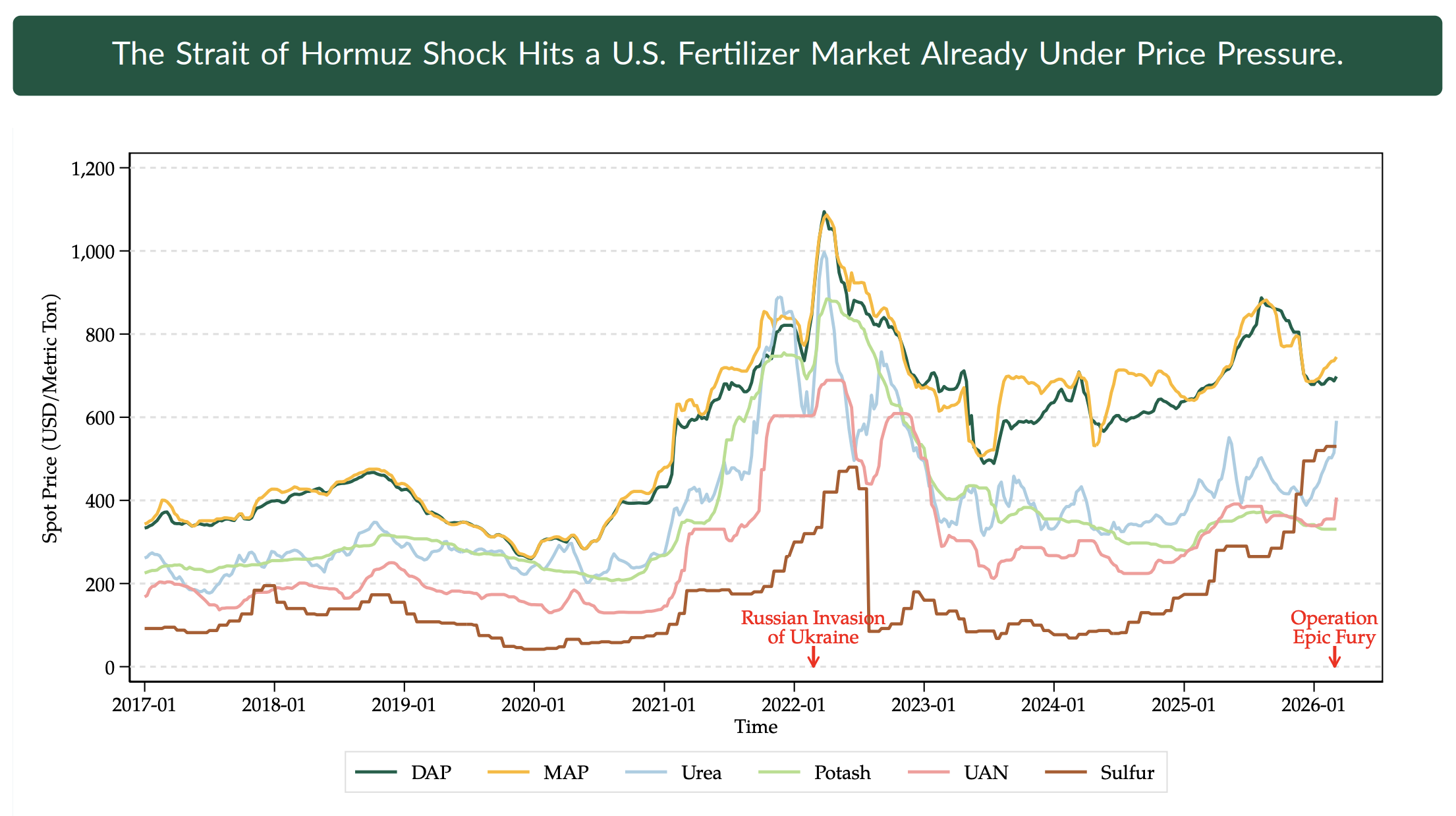 Figure 1: Fertilizer Spot Prices on the U.S. Gulf Coast. (NDSU Agricultural Trade Monitor, using data from Bloomberg)